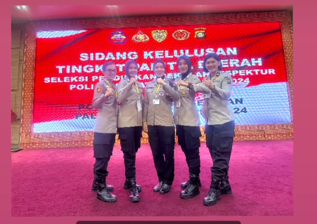 Lima orang Polisi Wanita (Polwan) Bintara Polda Sumsel dari 14 Polwan yang mengikuti seleksi dinyatakan lulus untuk mengikuti pendidikan Sekolah Inspektur Polisi (SIP) angkatan 53 tahun 2024 Salah satunya Polwan Bidhumas Polda Sumsel