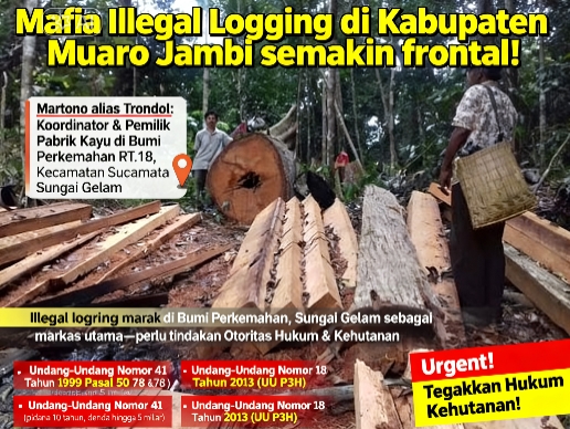 Konflik agraria dan praktik pembalakan liar (illegal logging) di Kabupaten Muaro Jambi, Provinsi Jambi, kembali memanas. Masyarakat sipil mendesak aparat penegak hukum untuk segera menangkap seorang tersangka yang diduga sebagai aktor intelektual di balik jaringan mafia kayu ilegal berskala besar di wilayah hukum Polsek Sungai Gelam. Desakan ini muncul karena aktivitas illegal logging tersebut diklaim semakin berani dan terang-terangan.