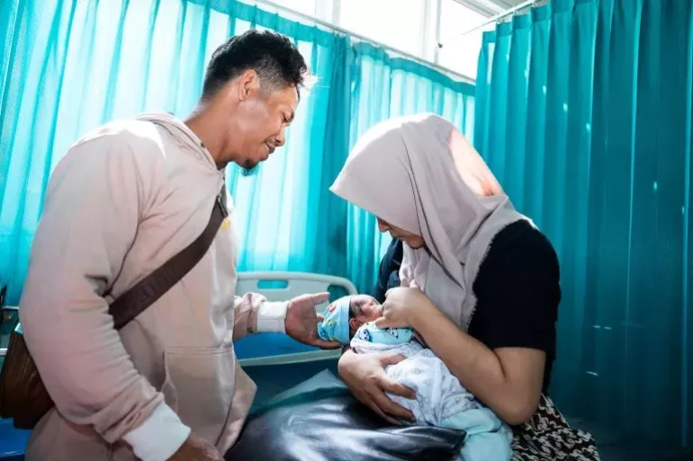 Mardiana, seorang ibu yang baru saja melahirkan di Puskesmas Sakra, bersama suaminya, Khairul, dan Rihana, bayi mereka yang berusia 11 hari, di Puskesmas Sakra, Lombok Timur, Nusa Tenggara Barat. (Foto: UNICEF/RED)