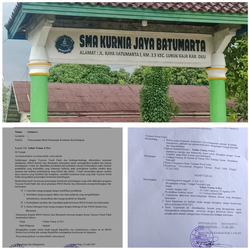 Sebuah kasus yang menyoroti praktik transparansi dan perlindungan guru honorer terjadi di SMA Kurnia Jaya,Kabupaten Ogan Komering Ulu (OKU). Yulian Triana, S.Th.I, seorang guru sejarah yang telah mengabdi selama 14 tahun, secara tiba-tiba diberhentikan dari posisinya. Pemberhentian yang tertuang dalam Surat Keputusan (SK) tertanggal 15 Juli 2025 ini diduga kuat merupakan bentuk pembalasan karena dirinya berani melaporkan dugaan penyimpangan dalam pengelolaan dana Bantuan Operasional Sekolah (BOS) di sekolah tersebut kepada sebuah Lembaga Swadaya Masyarakat (LSM).