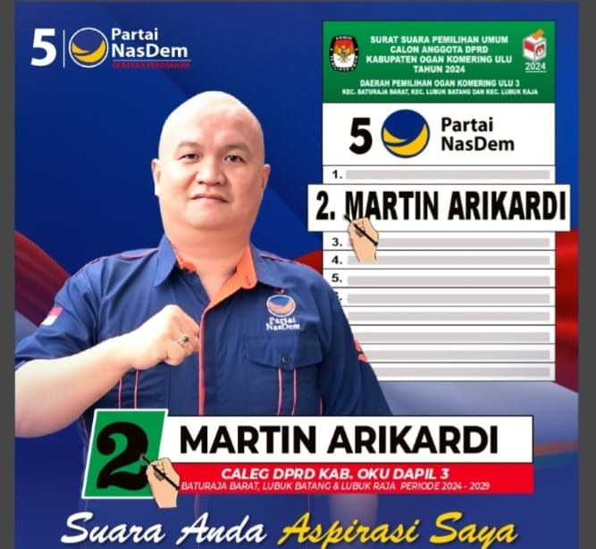 Martin Arikardi maju dari Partai Nasional Demokrat (NASDEM) di nomor urut 2 untuk Daerah Pemilihan (Dapil) 3 yang meliputi Kecamatan Baturaja Barat, Lubuk Batang, dan Lubuk Raja.