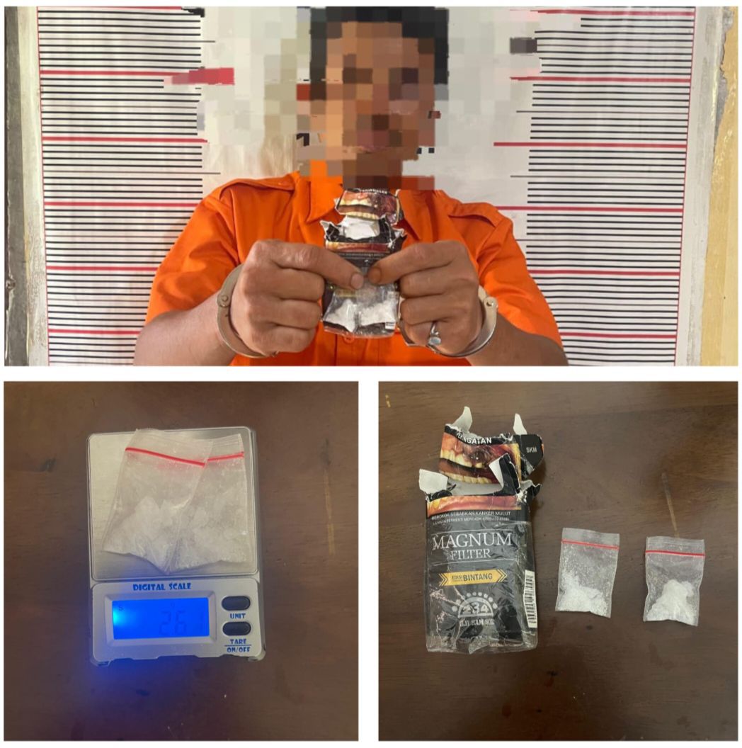 Setelah pelaku dapat dikendalikan,personil segera melakukan penggeledahan menyeluruh di sekitarnya. Dari penggeledahan inilah, polisi berhasil menemukan barang bukti krusial, yaitu satu bungkus rokok merek Magnum berwarna hitam. Di dalam bungkus rokok itu, tersembunyi dua buah plastik transparan kecil yang diduga kuat berisi narkotika jenis sabu-sabu.