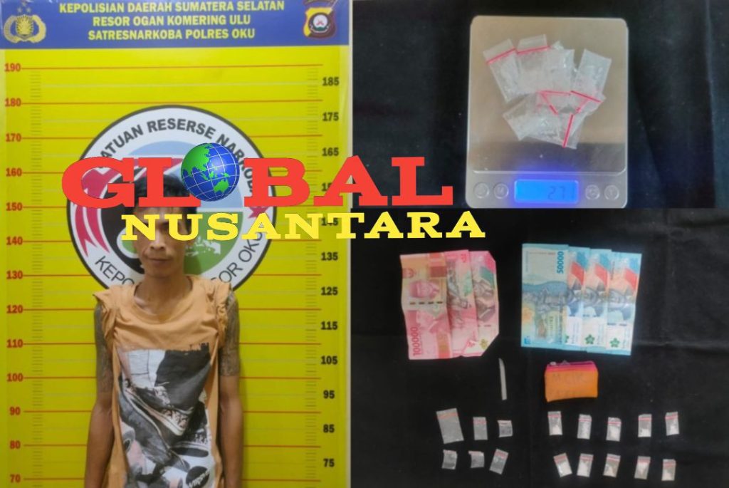 Anggota narkoba polres OKU telah melakukan penggerebekan sebuah rumah dan mengamankan seorang laki – laki yang mengaku bernama VY,kemudian dilakukan penggeledahan yang disaksikan warga setempat,lalu ditemukan barang bukti berupa 1 (satu) buah dompet warna coklat berisikan 10 (sepuluh) bungkus plastik klip bening masing-masing didalamnya berisikan kristal – kristal bening diduga narkotika jenis sabu dengan berat bruto 2,71 gram,yang di temukan dibelakang rumah dan dalam penguasaan tersangka dan diakui milik tersangka.
