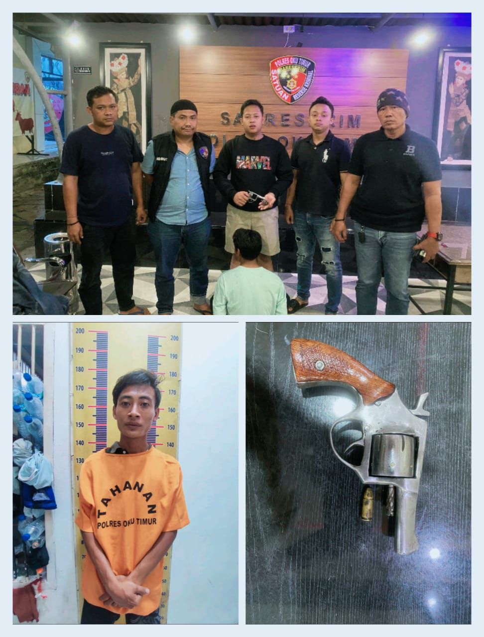 Saat itu, petugas mencurigai seorang pria yang duduk di pinggir jalan dengan gerak-gerik yang mencolok. Setelah dilakukan pemeriksaan, ditemukan sebuah senjata api rakitan jenis revolver berwarna silver bergagang kayu coklat dan 1 butir amunisi kaliber 9 mm berwarna kuning di bawah jaket yang dipangku oleh tersangka.