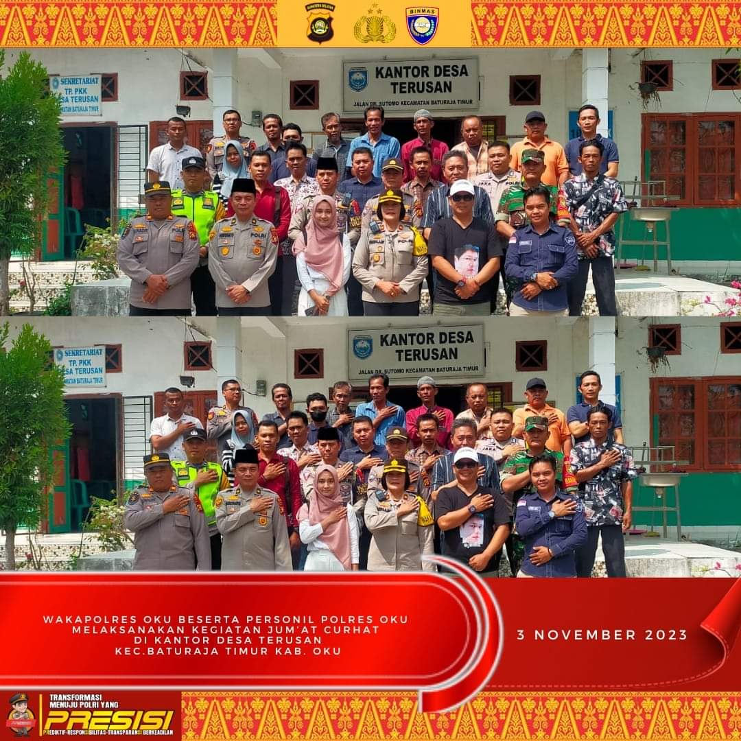Wakapolres Oku Sumsel beserta personil melakukan kegiatan Jum’at curhat didesa Terusan Kecamatan Baturaja Timur Kabupaten Ogan Komering Ulu.
